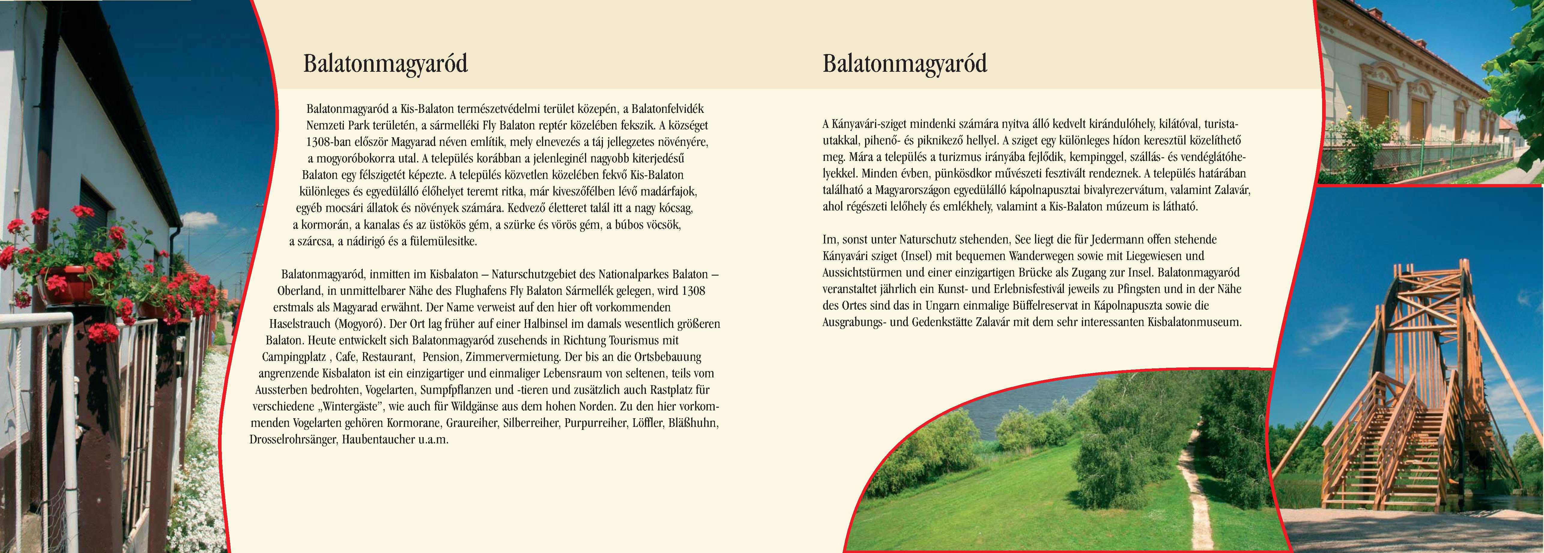 Nyilvános 2216 | 6300 | Balatonmagyaród | Balatonmagyaród, inmitten im Kisbalaton Naturschutzgebiet des Nationalparkes Balaton Oberland, in unmittelbarer Nähe des Flughafens Fly Balaton Sármellék gelegen, wird 1308 erstmals als Magyarad erwähnt. Der Name verweist auf den hier oft vorkommenden Haselstrauch (Mogyoró). Der Ort lag früher auf einer Halbinsel im damals wesentlich größeren Balaton. Heute entwickelt sich Balatonmagyaród zusehends in Richtung Tourismus mit Campingplatz , Cafe, Restaurant, Pension, Zimmervermietung. Der bis an die Ortsbebauung angrenzende Kisbalaton ist ein einzigartiger und einmaliger Lebensraum von seltenen, teils vom Aussterben bedrohten, Vogelarten, Sumpfpflanzen und -tieren und zusätzlich auch Rastplatz für verschiedene ,,Wintergäste", wie auch für Wildgänse aus dem hohen Norden. Zu den hier vorkommenden Vogelarten gehören Kormorane, Graureiher, Silberreiher, Purpurreiher, Löffler, Bläßhuhn, Drosselrohrsänger, Haubentaucher u.a.m. Im, sonst unter Naturschutz stehenden, See liegt die für Jedermann offen stehende Kányavári sziget (Insel) mit bequemen Wanderwegen sowie mit Liegewiesen und Aussichtstürmen und einer einzigartigen Brücke als Zugang zur Insel. Balatonmagyaród veranstaltet jährlich ein Kunst- und Erlebnisfestivál jeweils zu Pfingsten und in der Nähe des Ortes sind das in Ungarn einmalige Büffelreservat in Kápolnapuszta sowie die Ausgrabungs- und Gedenkstätte Zalavár mit dem sehr interessanten Kisbalatonmuseum. Dieses Text stammt von: Pannonhát tájpark prospektus 2006. Web: http://www.pannonhat.hu/ (auch in Deutsch) |